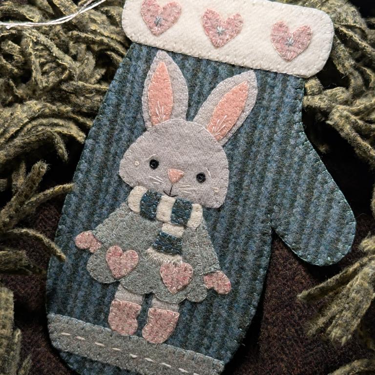 ~~~Sold~~~Clara Bunny with Pink Heart Wool Mitten Ornament