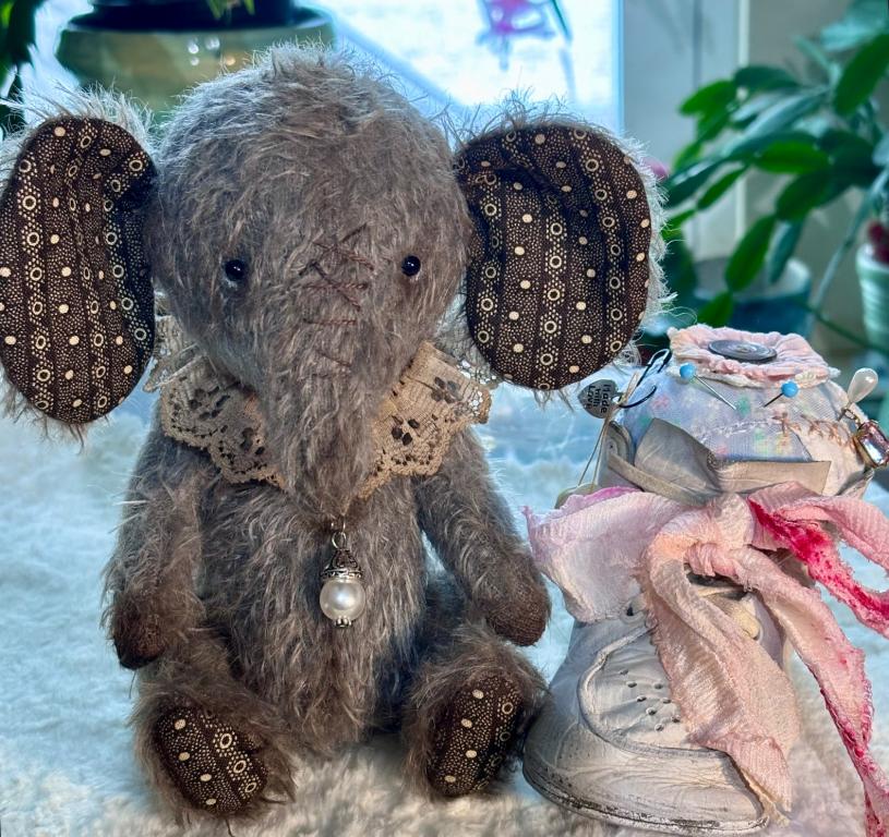 Elsie is made of imported German gray distressed mohair and handmade imported German glass eyes. I created her using a pattern from a designer on instagram. She is all handsewn and stuffed with premium fiberfill and weighted with glass beads. I have used pan pastels to tint her and age her a bit. I gave her a little lace collar I made using some of my eco dyed lace and I’ve sewn it together onto a piece of wool then sewn in the back of her neck. She stands a little over 7” tall and is 3” wide and sits 6” tall. She will come with her vintage baby shoe that I made a pincushion in it out of an of old tattered quilt piece. I’ve done some hand stitching on it and added a yo-yo, tiny bit of lace under it and a vintage MOP button on the top. The shoe is 5” long and the piece is about 3 1/2” tall. If you have any questions please ask. Kindly asking $175 plus $6 shipping. Thank you so much .