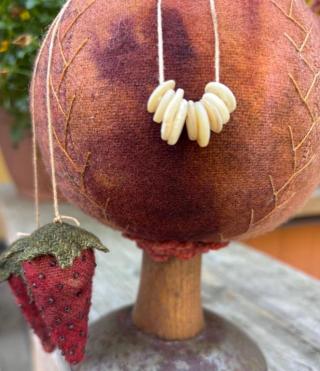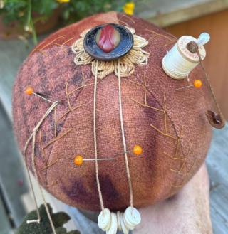 My first make do (or primitive pincushion) is made of overdyed and as is wool. The wools are beautiful rusty, reddish, orange brown colors and even though I took pictures outside the colors may vary in person. I have stuffed this tightly with premium fiber fill and hand stitched some embroidery stitches on the seams. On top is a piece of eco dyed lace and a vintage (what I believe is a Bakelite) button. The make do is mounted on a large hog scraper that has a wooden handle and metal base. I have attached 2 overdyed wool strawberries all beaded with vintage beads, small thread spool simply attached with a large rusty safety pin and a small string of vintage mother of pearl buttons. The bottom of the make do is trimmed with chenille ric rack. The base is 4” wide, the make do is 5 1/2” wide and total of 7” tall to the top of the make do itself. The strawberries are 2” and 2 1/4”. Shipping I’m sorry will be more because of the weight and size. Kindly asking $85 plus $10 shipping. I will refund any overage of a $1 or more. Thank you so much for stopping by.