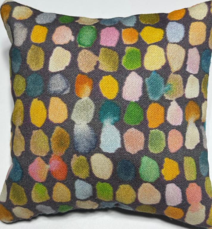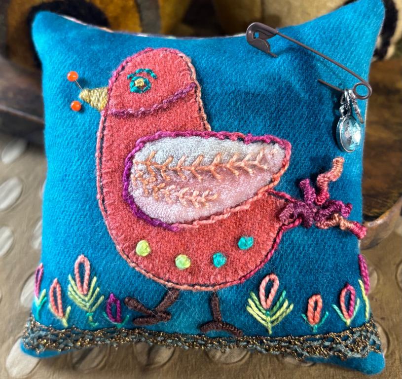 This little overdyed wool pincushion is made using a chick from a Sue Spargo pattern that I’ve added some fun stitches to and even used a piece of velvet to create her wing! Using lots of fun Sue Spargo stitches from her book and some simple ones I’ve added little simple flowers and a vintage metallic trim along the bottom. The backing is a fun polka dot cotton fabric and it’s stuffed full with crushed walnut shells! It weighs nicely at 5.8 ounces and I’ve added some glass pins to her beak! It measures 4” x 4”. If you have any questions please ask. Kindly asking $70 which will include the shipping. If you click on the main page you will see the backing fabric I used.