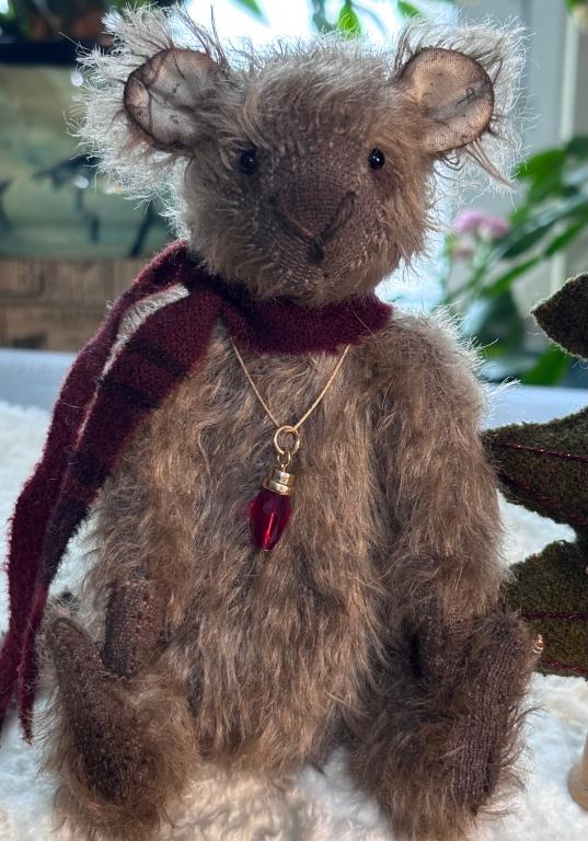 Mitsy is made of imported German distressed mohair and has handmade German glass eyes. She is made from a pattern I got on Tedsby by one of my favorite designers Tetiana Sadovska. I have completely handsewn her. She is 5 way disc jointed so all her limbs and head move and he’s been tinted and aged using pan pastels. I have used glass beads to weight her and she has a distressed tail as well. ( sorry hard to see in the pics!) she will come with her little handsewn wool tree I made out of overdyed wool and added some sparkle valdani thread for a garland and used gold glittery DMC thread for little knotted “ornaments”. She is 7” tall , 3 1/2” wide at her bottom and sits 5 3/4” tall. The wool tree is 5” tall and about 4 1/2” wide at the bottom. If you have any questions please ask. Kindly asking $165 plus $6 shipping.