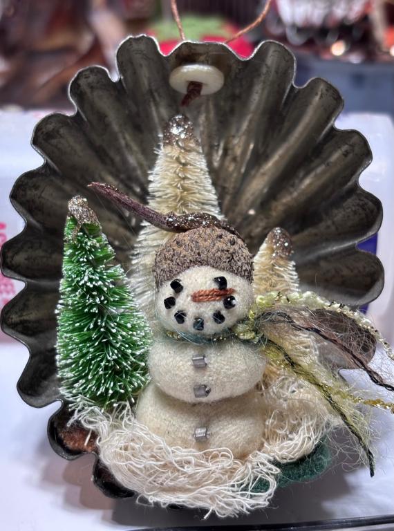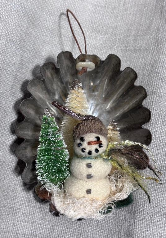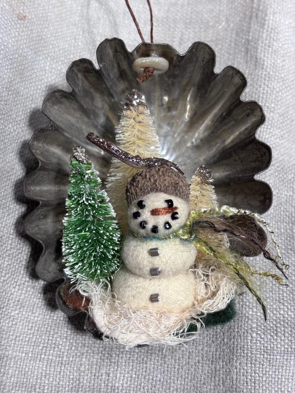 My first offering is this vintage little tin, with a lovely old patina, that I’ve used to create an ornament out of it. I have sewn the snowman onto several pieces of fabric including either wool, lace and/or cheese cloth. Then I’ve glued everything down into the bottom of the tin. Using waxed linen I tied a knot thru a small button, then drilled a hole thru the top of the tin to pull the waxed linen loop thru it and glued the button to the top of the tin to be able to hang the ornament. The snowman is all handsewn out of wool, stuffed to make into balls, attached to each other and then added small vintage glass beads for eyes and buttons. He has an acorn cap and I’ve also glued in some sisal trees in the tin as well. The snowman is 1 1/2” tall, the tin is 3 1/2” tall by 2 1/2” wide. If you have any questions please ask. Kindly asking $38 plus $5 for shipping. Thank you so much.