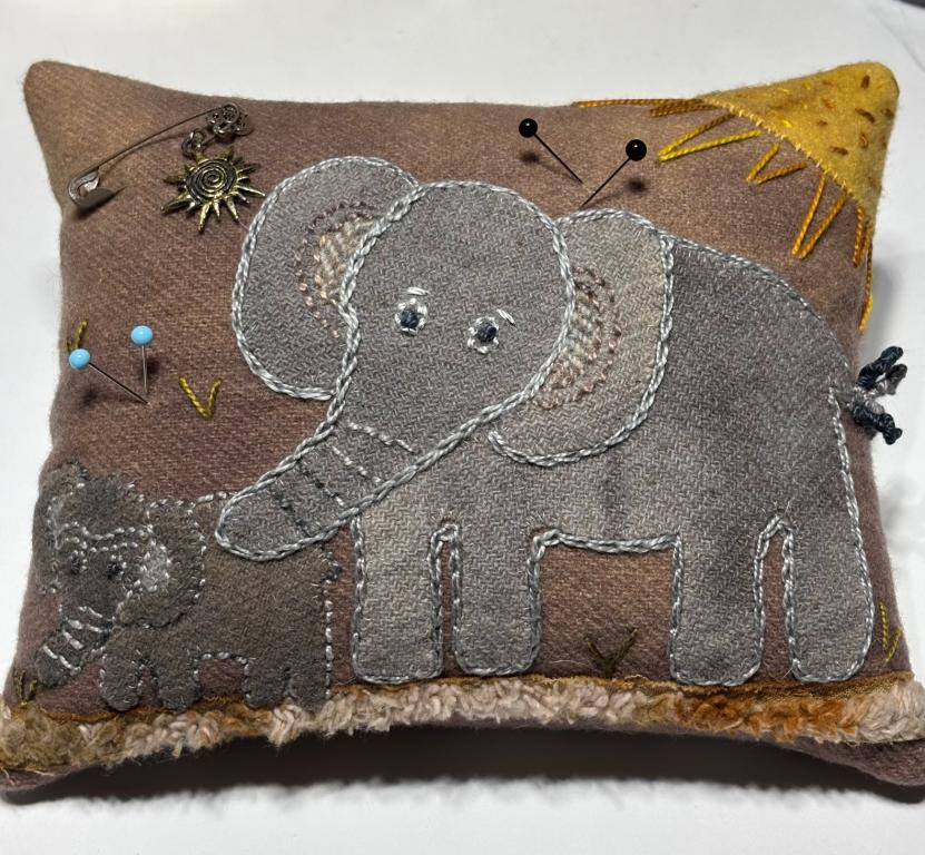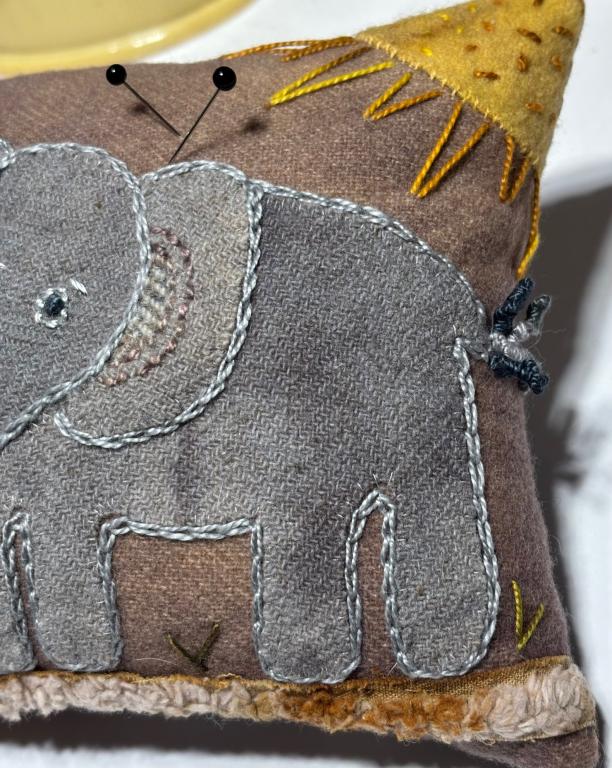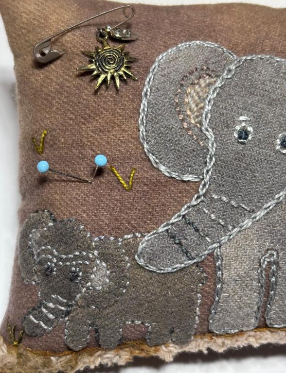 This is my sweet mama and baby elephant appliquéd pincushion. I used overdyed wool for the background and the elephants. I’ve used a piece of batik fabric for the backing. The pincushion is stuffed with all crushed walnut shells and is heavy at 1 pound 7 ounces. It measures 7” x 6” and about 2+” thick. I used a pattern from a Sue Spargo book and added lots of embroidery stitches with her embroidery threads. If you have any questions please ask. Kindly asking $100 which will include shipping. Thank you for stopping. To see more images click on main image.