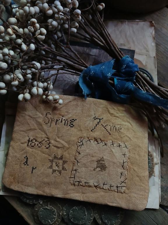 Happy Spring! Up for your consideration is a sweet 'Spring Tyme' flat primitive sampler... Perfect to put in an old primitive wooden bowl or lay on an old primitive table... Measures approx 5" x 6 3 /4" ... Backed in the sweetest reproduction brown and blue fabric... Stitched on linen, antiqued, and wrinkled for an aged look.. Email jltg5@aol.com if interested... $55 w/travel fare included.. Thank you for visiting!