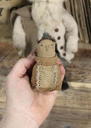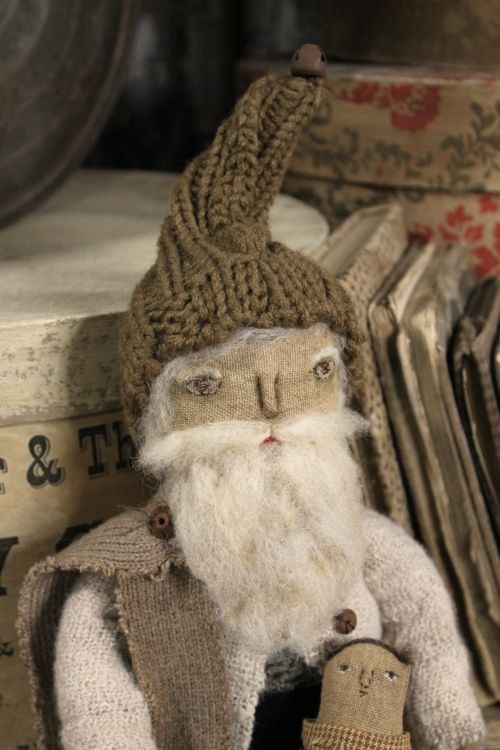 Hello and thank you for visiting my page. My November offerings include three small but sweet Santa dolls. This little guy measures just 8.5 inches tall seated. He does not sit on his own and his legs are sewn into place. His body is made from a soft, green plaid fabric. His arms are wired for posing and he has a sweet, stitched face and wool beard, brows and hair and a teensy, tiny, needle felted mouth. He has a stocking hat with a rusted bell tied to the end and a soft, lightly aged coat with wooden beads serving as buttons. His boots are painted on and he has an aged scarf and he comes with a teeny, tiny doll. The little baby doll measures only about three inches long with a stitched face and a sweet, little dress and apron with wool hair. The Santa doll will come with a signed and dated tag. **** If you would like to purchase this sweet Santa, please send me an email at buttonboxmerc@yahoo.com and let me know that you'd like Santa #2 I accept PayPal as payment so please include your PayPal email address as well as your zip code so I can figure the shipping. Thank you so much for stopping by. Wishing you all a very Happy Thanksgiving and I'll "see" you again in December! Santa #2 is $65 plus shipping