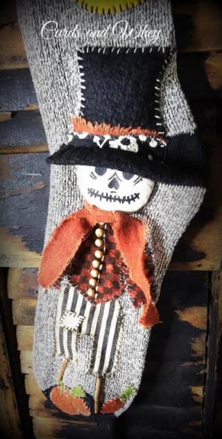 I fashioned this cool SKELLY STOCKING to hang for the Halloween season.  It's full of dimension and character, right down to the stick arms and legs and pumpkin patch at his feet.  ** Be sure to click the photo for additional views!