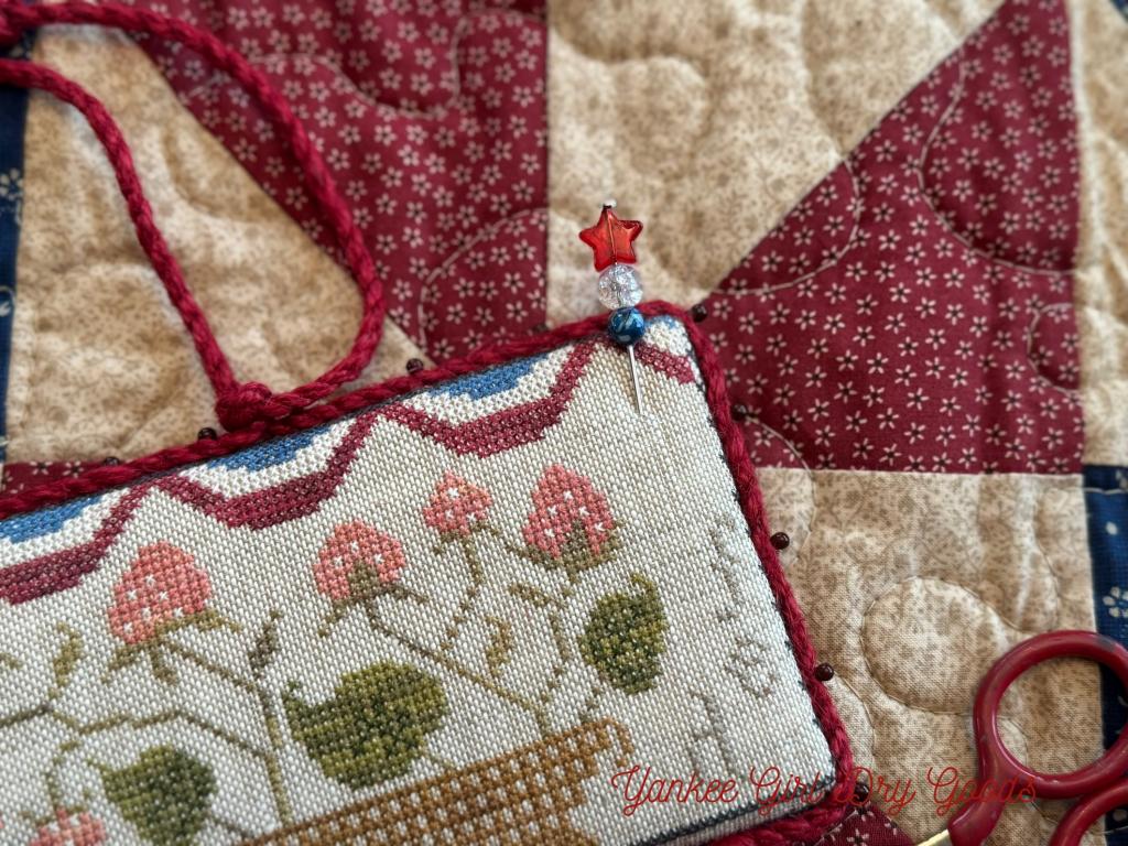 I knew the minute I saw this sweet strawberry basket I had to create this pin-disc especially for it. It’s a pattern by Stacy Nash Primitives. I added some red jute cording around the edges and some burgundy glass-head pins. I made a perfect patriotic glass pin just for this pinkeep. The back is a beautiful blue fabric that matches perfectly. It is approximately 61/2” x 4”. Kindly asking $75 and $7 for travel fare.