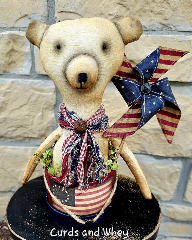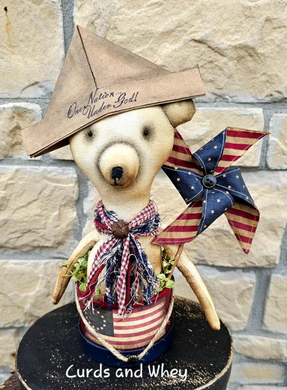 Tate is a sweet lil bear made from an old grain sack. He is tucked into a patriotic drum, surrounded with bits of greenery. His patriotic pinwheel is permanently stuck inside the drum. His "One Nation" sailors cap is removable. Tate measures 10" tall. *Click the photo for additional views*