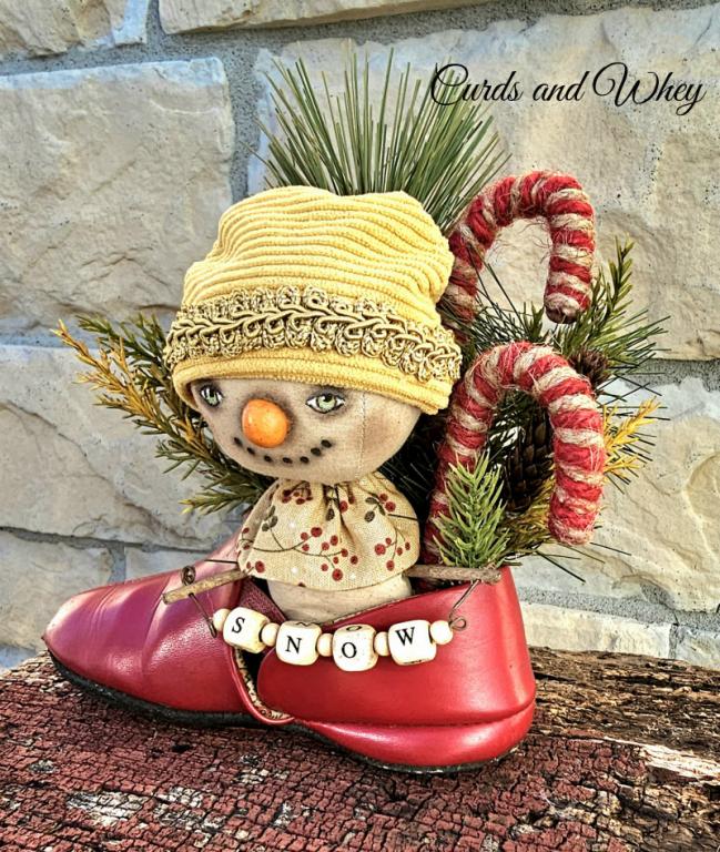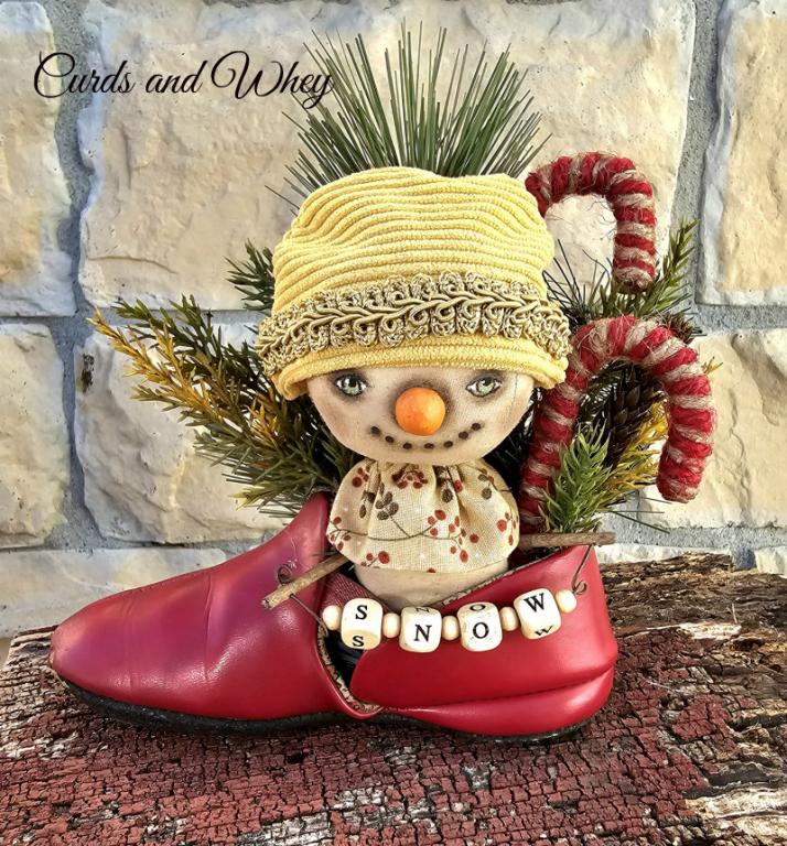 You can find Teeter looking to the skies, waiting for the first flurries to fly! Tucked into her very vintage child's slipper, she comes surrounded by lovely greens and candy canes. *Be sure to click the photo for additional views*