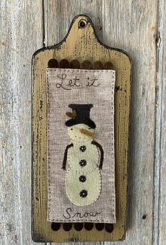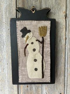 This is an 8 1/4" x 4 1/4" mat I designed and stitched. The background is a wonderful hand-dyed linen by Blackberry Primitives and the snowman with a top hat and broom are created with hand-dyed wool. The buttons are wool with decorative stitching. It is backed with a brown flannel and stitched all together by hand using a blanket stitch. It will arrive on one of our black boards. Shipping is included in the price.