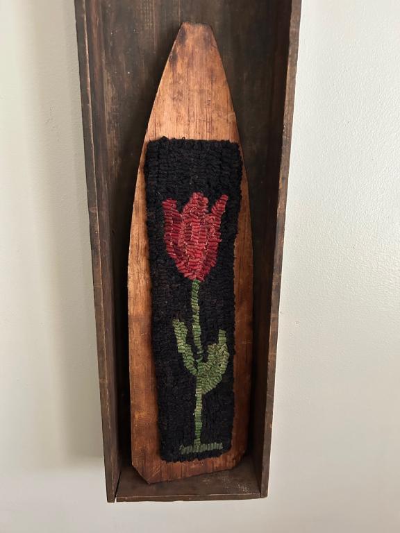 HookA sweet tulip I hooked added to a antique stretcher adorable out in a basket on a shelf etc Measures approximately 14” x 4” Thank you for visiting Happy Spring $42.00