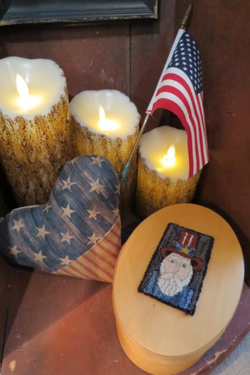 ***CLICK IMAGE FOR ADDITIONAL PHOTO***...I am trying a different approach and am offering two options for purchase: The Punch Needle Shaker Pantry Box alone - OR- the box, along with the patriotic plate and easel. If someone else purchases the box alone, you will need to email me about the plate and easel, if interested in only that purchase. Included inside the box will be an article about the use of Shaker pantry boxes in the past....nice info to have on hand. Uncle Sam was punched needled using a mix of Valdani and DMC thread. The Shaker box (not an antique) measures roughly 7 1/4" x 5" and the glazed clay plate measures 8" in diameter, with a metal easel included. OPTION #1.... I am kindly asking 68.00 for the Shaker box alone (plus postage)......OR....OPTION #2...I am kindly asking 84.00 for the Shaker Box, Plate and easel, plus postage. That is a whole display put together for you! Please email mommadonnatx@gmail.com to make a purchase. Thank you for your kind visit today to PHM!