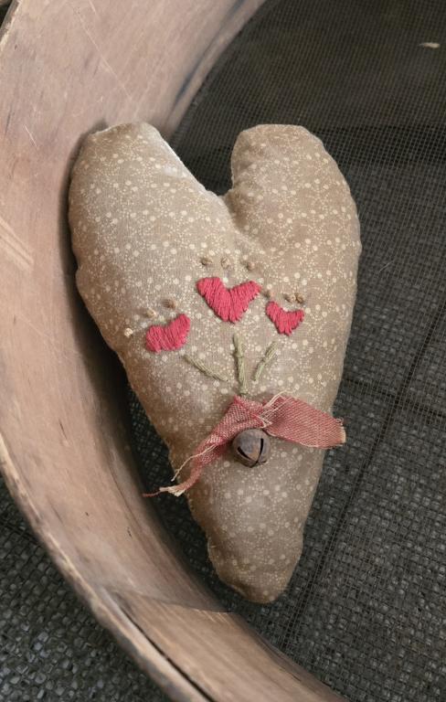 NeedfulsA cute heart bowl filler. Made from vintage calico fabric, embroidered, rag stuffed and adorned with a rusty bell. 6"x3 3/4". Pending.