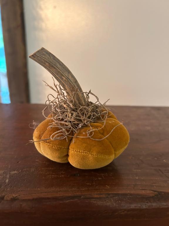 NeedfulsI made this mini velvet mustard colored pumpkin out of primitive velvet from Blackberry Primitives…it measures approximately 3” x 5” …. I added a real dried pumpkin stem and Spanish moss to give it a more rustic prim look…