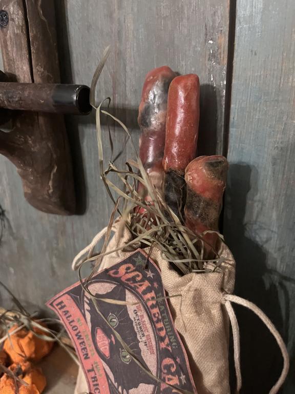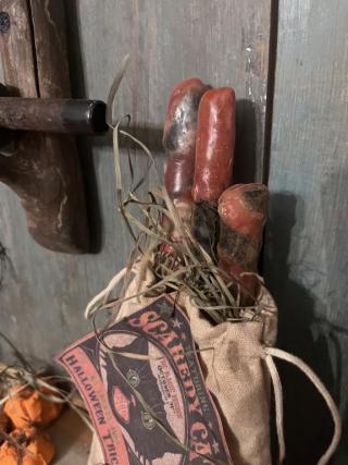 HalloweenPerfect for Halloween!! A very grungy pouch that has been aged and tattered filled with wax candy sticks for Halloween! The sticks measure between 8-9 inches and 2 come in the pouch with cat label. Makes great cupboard tuck. Price includes travel