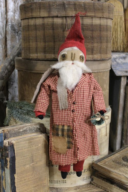 SOLD These sweet hanging Santas are small enough to hang most anywhere and he's very lightweight. A bit too big for your tree though. They measure about 13 inches long and they're so handsome! They have a red "snowsuit" body with a little coat and scarf that's tied off with a rusted jingle bell. His face is hand stitched with needle felted. wool hair. beard and brows and even a teensy needle felted mouth. He has a couple of wooden beads serving as buttons and some sewn on patches and he's carrying a festive Christmas wreath. Santa will come signed and dated and he is $39 plus shipping * Click on his picture for additional photos**** To purchase, please send e an email at buttonboxmerc@yahoo.com and include the name of the item you wish to purchase as well as your zip code and the email you use for PayPal. I'll be back again on December 18th with some more snow ladies. Payment is due once invoice is sent. Thank you so much for stopping by!