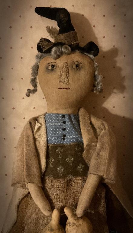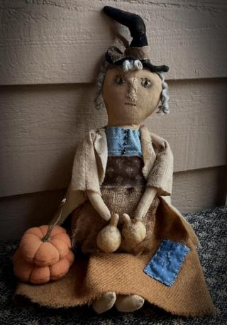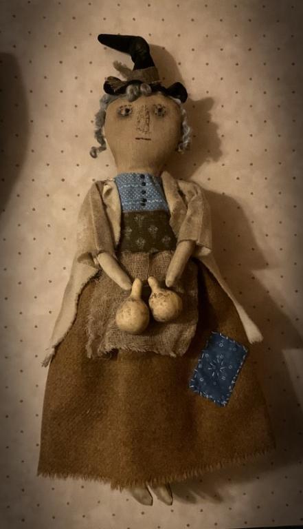 She holds her favorite gourds in her hands and her favorite set of wool pumpkins. She is 22 inches tall. She is firmly stuffed with poly and fabric snips. Definitely a sweet witch that will put a smile on your face! Pattern is from Cinnamon Creek Primitives. Shipping is included in the price. She would love to make a trip to your home for your primitive decor!