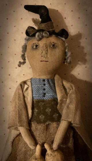 I would like to introduce "Winifred". She is primitive, but sweet as can be. She is made from linen that has been antiqued. She wears her tattered clothes of wool and cotton. She has tiny seed beads sewn on her dress. She wears her fancy velvet hat, that can be removed, so she can stay out year round. She is real sheep's wool for hair.