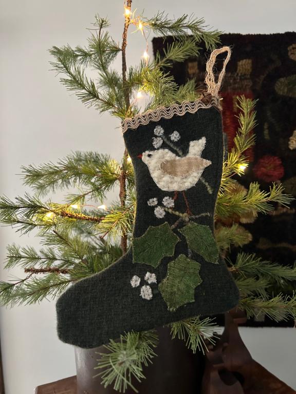 Winter bird design by Michelle Palmer…I made stocking out wool appliquéd bird deign with wool, added yarn for branches..,added twine trim a rusty pinball bell….measures approximately 6” x 8”
