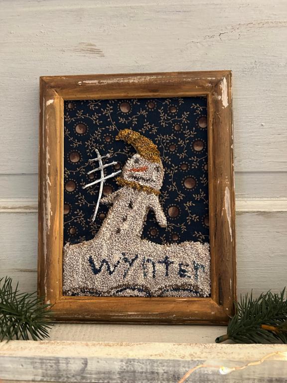 This snowman is a design by Robin of Bird In The hand Primitives…I created him in a punch needle form using valdani threads then cut him out attached to primitive fabric added him to a frame I painted and distressed… this framed piece measures appropriately 9 1/2” x 8”… This would be adorable out all winter long….