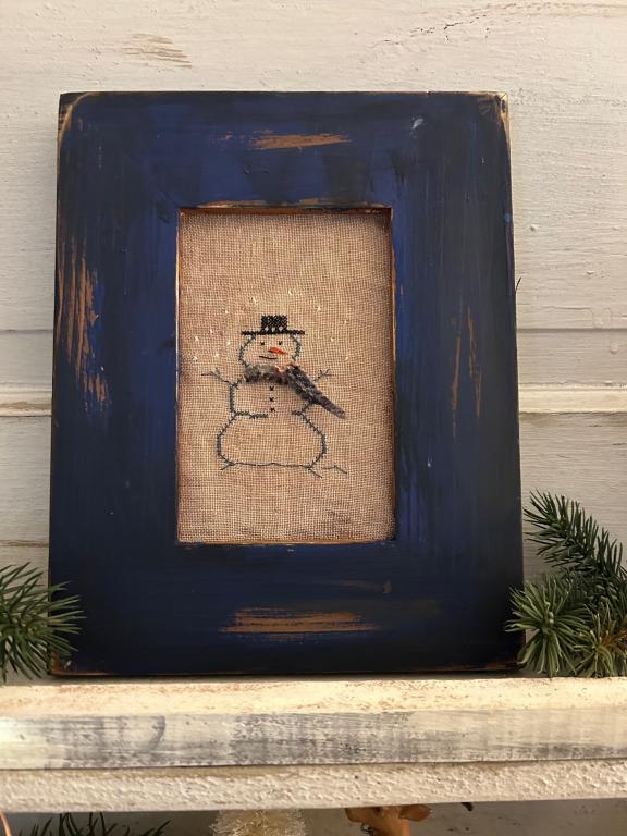 I stitched this sweet winter thyme snowman on 36 ct linen..I added a wool scarf…I put into a primitive frame I painted blue added black sanded then added a wax sanded again…This would be adorable displayed all winter long
