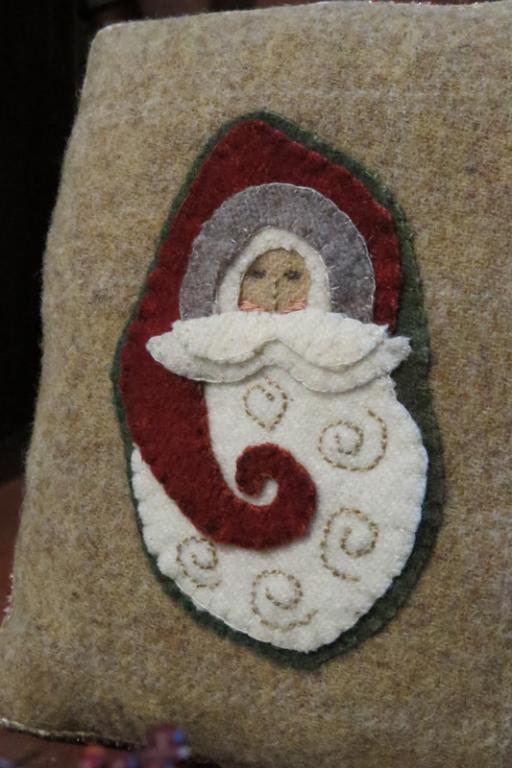 ***CLICK ON IMAGE TO SEE ANOTHER IMAGE***...I am offering this sweet wool, appliqued Santa face pillow. All parts are made with 100% wool and the facial features are sewn using DMC thread. There is also an edging that is made of two kinds of trim.....a beige/cream patterned twill tape, used with a peppermint style chenille yarn. This really dresses up the edge without getting too fussy. This small pillow measures about 7"H x 5 3/4"W and is stuffed with a lightweight natural cotton batting. I am kindly asking 69.00 plus postage. Please email mommadonnatx@gmail.com to make a purchase. I gladly accept paypal. Thank you so very much for your visit today to PHM! I hope you have a joyous holiday season!