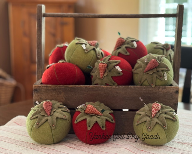 I love making these tomatoes so much and thought a strawberry on top was the perfect choice. This was made using beautiful hand dyed red and green wools from Blackberry Primitives. I added a few black pins, a beautiful antique glass swirl pin and a silver heart in hand charm. It’s firmly stuffed/filled with 2 1/2 - 3 cups of crushed walnut shells to keep your pins and needles sharp. The pink strawberry is firmly attached to the tomato. It is approximately 4 1/2” tall. Kindly asking $95.00 and $10.00 for travel fare.