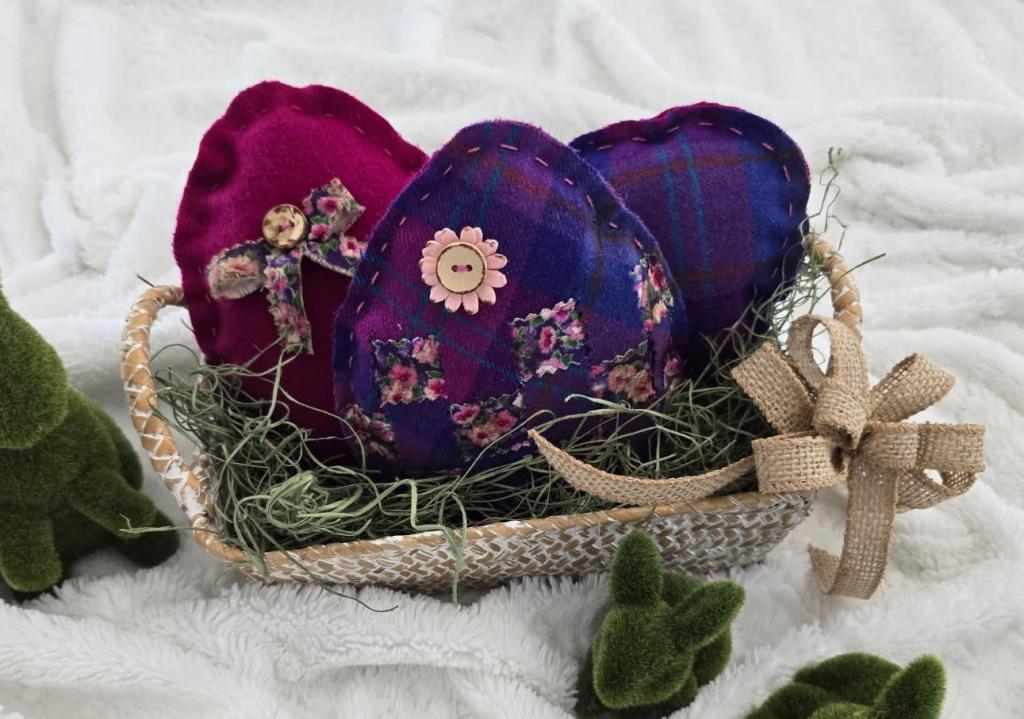 I love to recycle good cleaned materials turning them into new WHIMSICAL items with a happy purpose. Here is a happy little BASKET OF WOOLEN PLAID PURPLE EASTER EGGS. The 3 eggs were made from a pretty Purple Pendleton blazer that was at least 30 years old. It's been in my sisters closet, too small to wear, but the wool fabric was too pretty to part with. So we made some cute, stuffed EASTER EGGS, adorned them with some vintage buttons, and stowed them in a cute little white brushed basket. Perfect to display on your mantel or side table. The EGGS are about 6 inches tall. A new life for items who's usefulness had passed but now, can bring a smile to your face. Kindly asking $19 with an additional $6.96 shipping. Email me at VG004@COMCAST.NET to arrange payment for your purchase. I accept PayPal and Personal Checks. Thanks so much for shopping with our group!