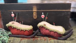This is probably my favorite holiday creation this year! These sleighs are made from 100% wool and stuffed firmly with sawdust. It is approximately 3” x 61/2” long. The runners of the sleigh are wired so they can be curled more or straightened. I added rusty bells all around the sleigh to resemble old sleighs from days gone by. I added an antique green swirl pin, several glass head pins and a sweet peppermint glass pin that I created for the season. Kindly asking $95.00 and $10.00 for travel fare. *My creations are not toys and should be kept out of reach of anyone under 12 years of age.